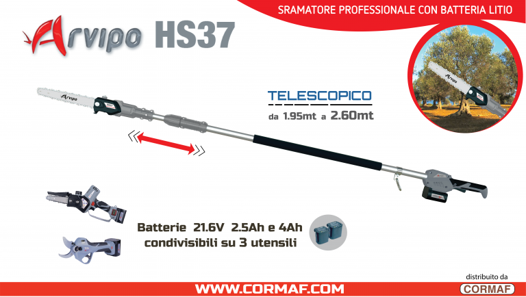 Il nuovo ARVIPO HS37 PRO incorpora il sistema di lubrificazione automatico che evita inutili fermate nel giorno della potatura, rendendolo uno strumento più efficiente.