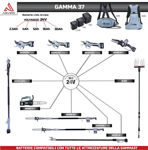 Inoltre, come suggerisce il nome, la famiglia ARVIPO 37 aumenta, dando più versatilità alle sue batterie e creando un set di strumenti per la potatura molto potente per le sue qualità ad alte prestazioni sul lavoro.